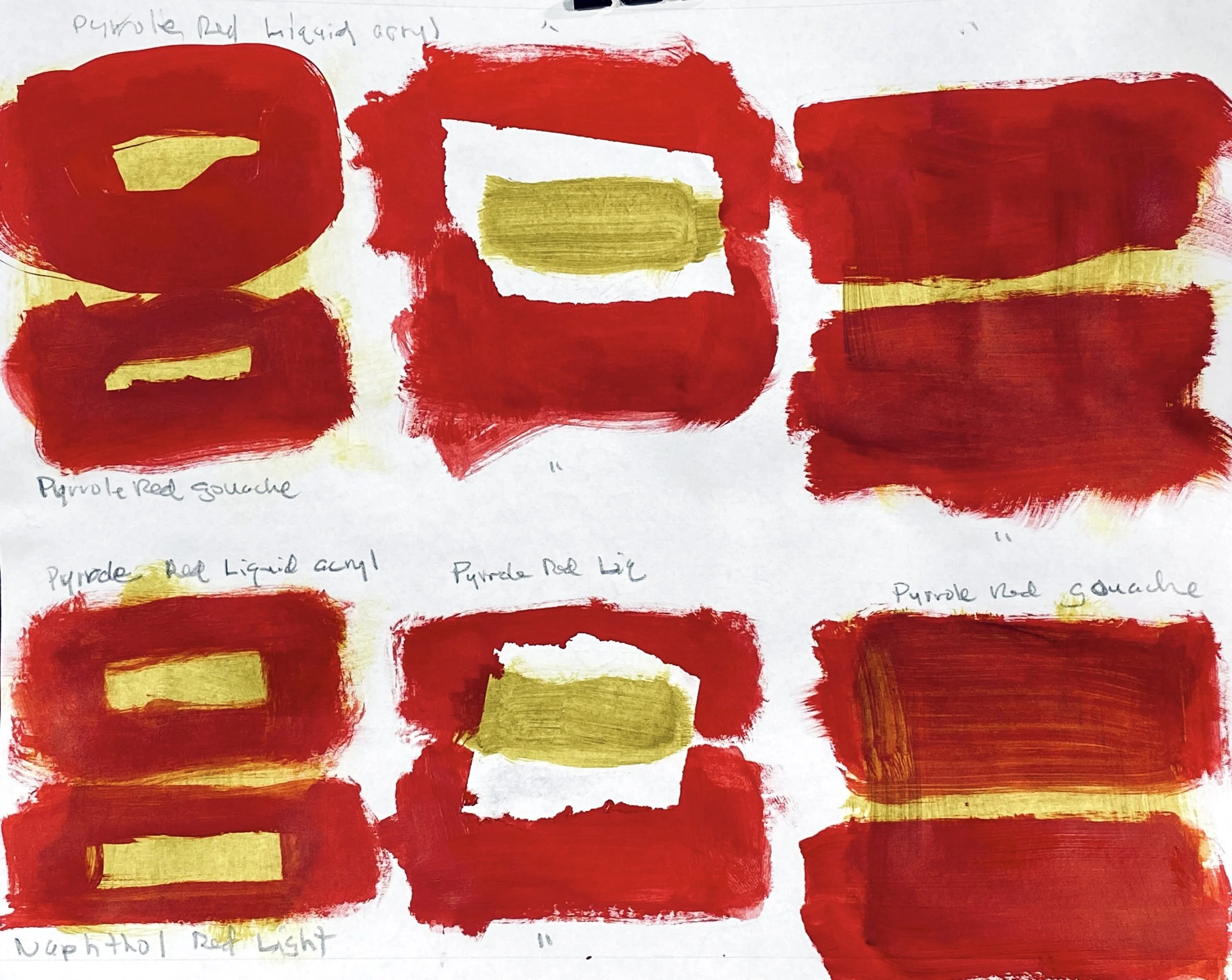 I do not work with red very often. Pinks, peach, purples, lilac but not much red. For some reason I needed to see Pyrrole Red. I don’t often do physical color studies before painting either, but I took a look at a good handful of combinations and glazes before starting this one.